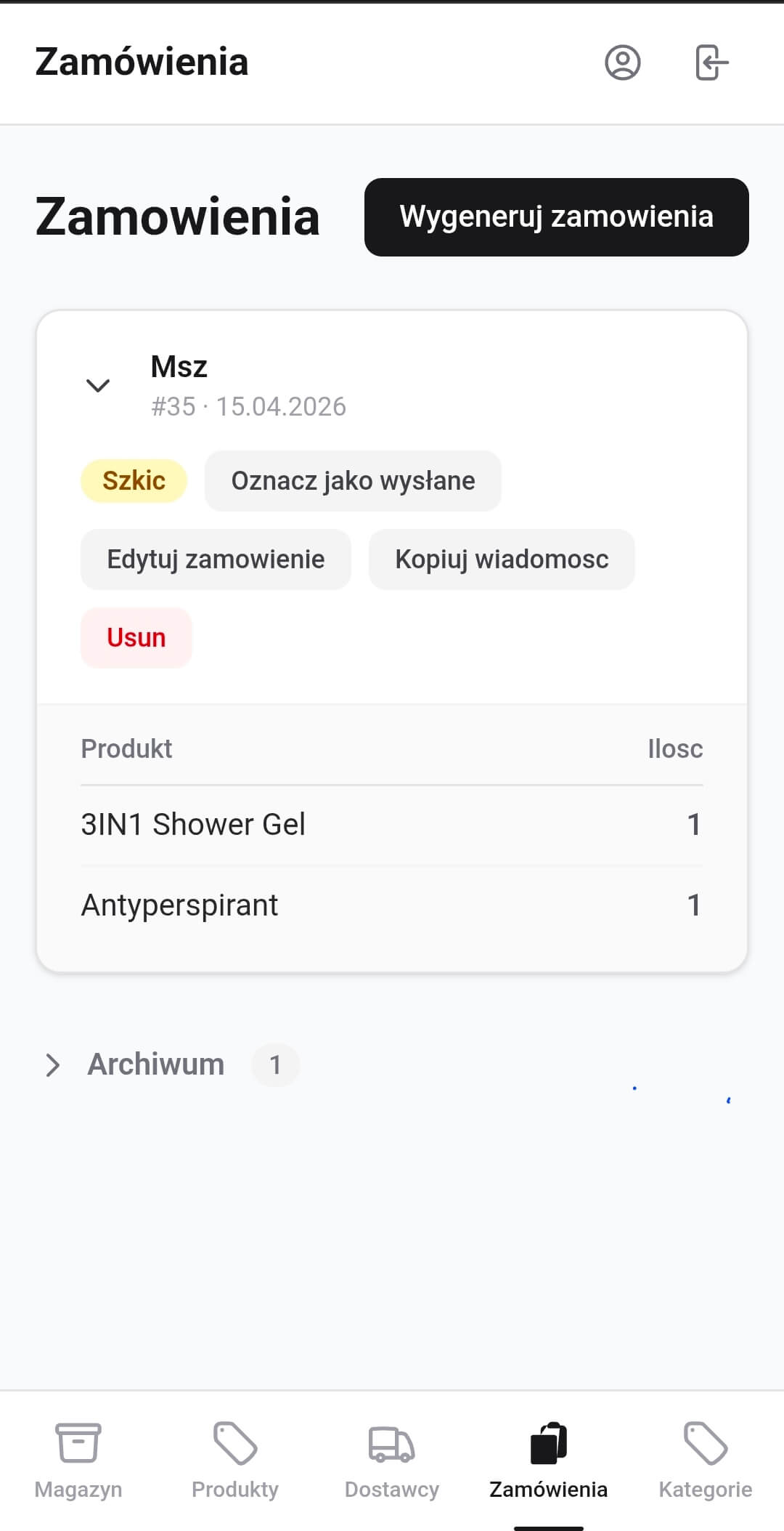 Tak. Dodajesz dowolną liczbę dostawców i przypisujesz do nich produkty. Zamówienia są generowane osobno dla każdego dostawcy, a wiadomość do dostawcy możesz skopiować jednym kliknięciem.